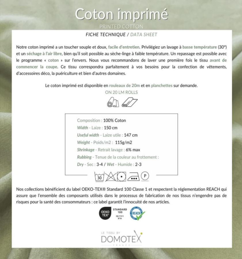 Nos tissus sont certifiés OEKO-TEX, garantissant qu’ils sont exempts de substances nocives. Cette certification assure que notre cretonne est sûre pour votre peau.