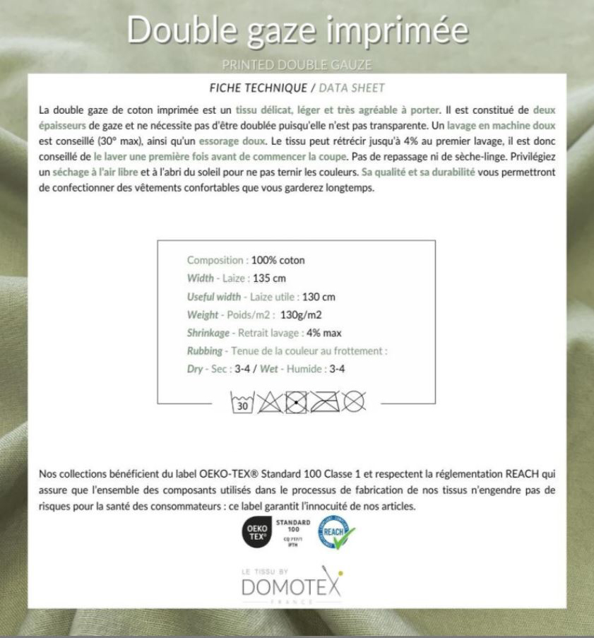 Nos tissus sont certifiés OEKO-TEX, garantissant qu’ils sont exempts de substances nocives. Cette certification assure que notre double gaze est sûre pour votre peau et respectueuse de l’environnement.